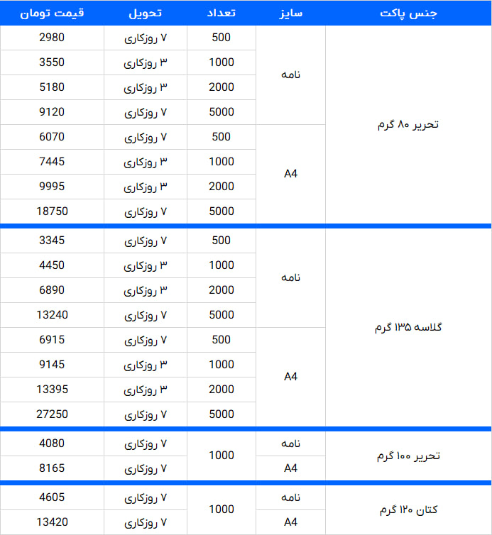 | A4 | 500 | 6,070,000 | 7 روزکاری |