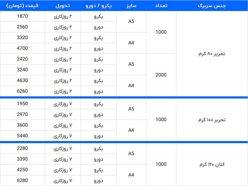 | 1000 | A5 | یکرو | 1,870,000 | 2 روزکاری |